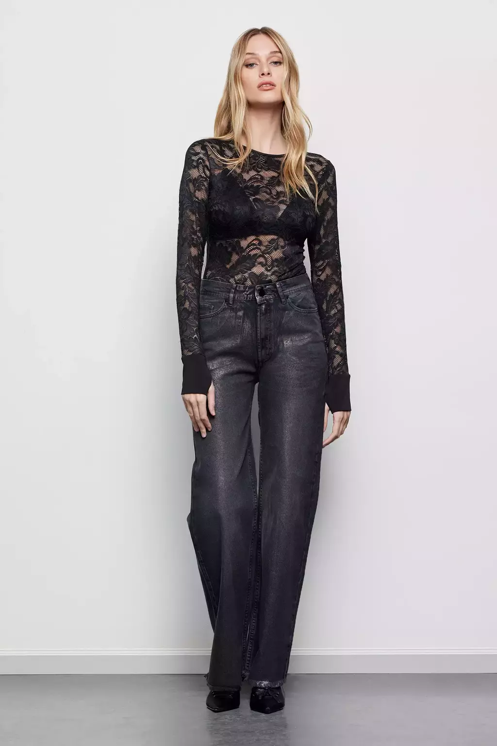 Pantalon de denim tiro alto fit wide leg. Un clasico reversionado. Lavado negro con proceso artesanal de foil peltre que lo hace un articulo super canchero. Metales jeaneros pulidos con un baño black niquel. Bota manga con delicado desflecado.