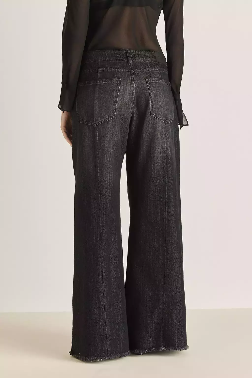 Pantalón de denim tiro medio fit wide leg con detalle de recortes en pierna delantera y trasera. Tejido importado con tencel que le aporta frescura, comodidad y caida. Lavado negro envejecido que lo hace tu aliado versatil ideal tanto para el día. Boton, remaches y chapita pulidos espejo exclusivos de la marca.